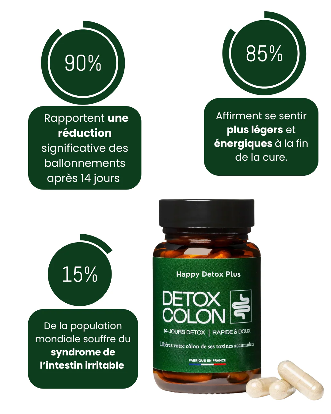 90 % des utilisateurs constatent moins de ballonnements en 14 jours, 85 % se sentent plus légers et pleins d’énergie, tandis que 15 % de la population mondiale souffre encore du syndrome de l’intestin irritable. Happy Detox Plus agit là où c’est nécessaire.