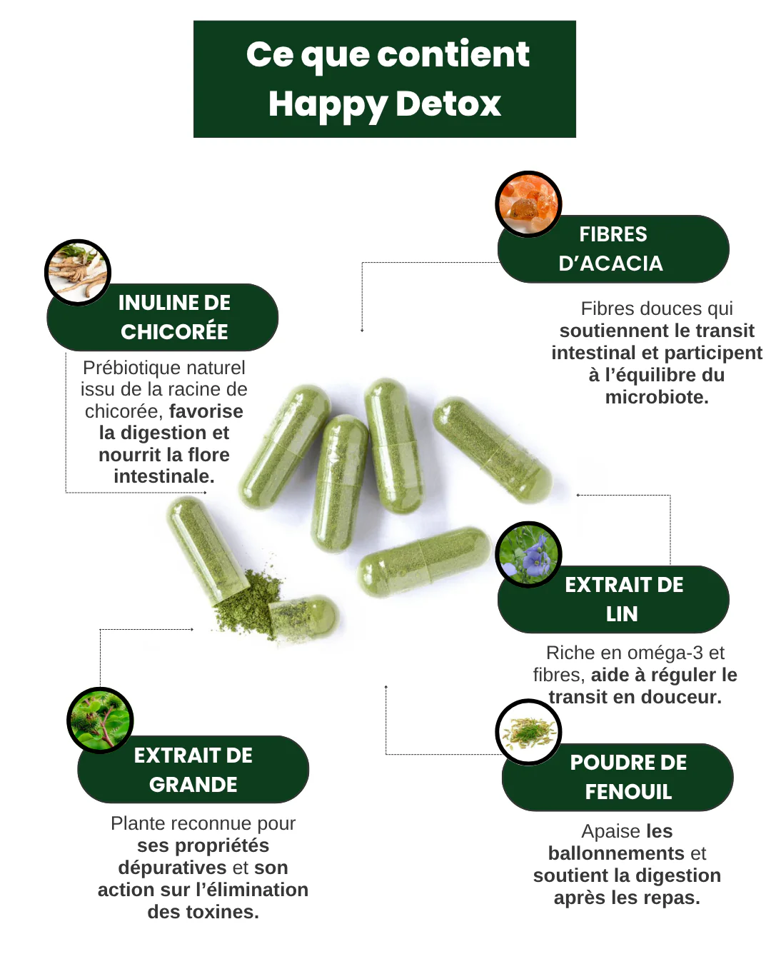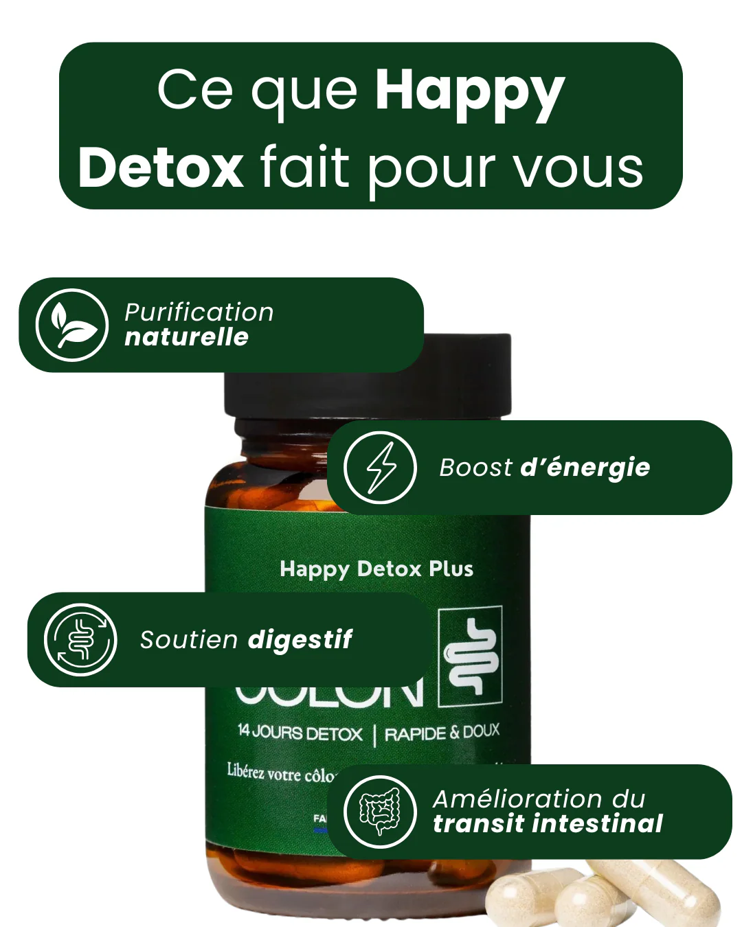 Happy Detox Plus agit naturellement pour purifier votre corps, stimuler votre énergie, améliorer votre digestion et favoriser un transit intestinal fluide – pour que vous vous sentiez léger et revitalisé chaque jour.