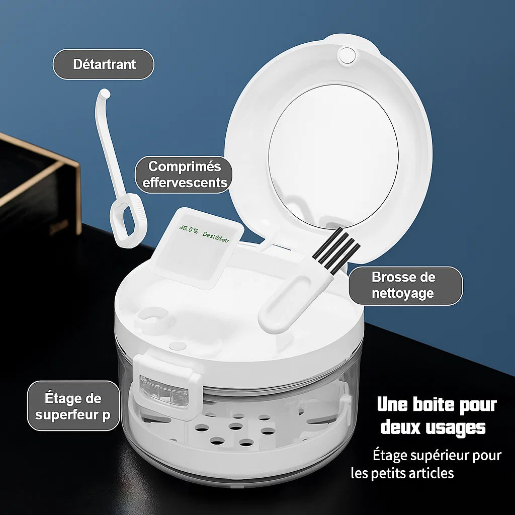 Cet étui compact 2-en-1 comprend un plateau de rinçage intégré pour un nettoyage facile, une ventilation pour éviter les odeurs, et une conception robuste pour garder vos facettes protégées. Idéal au quotidien comme en voyage.
