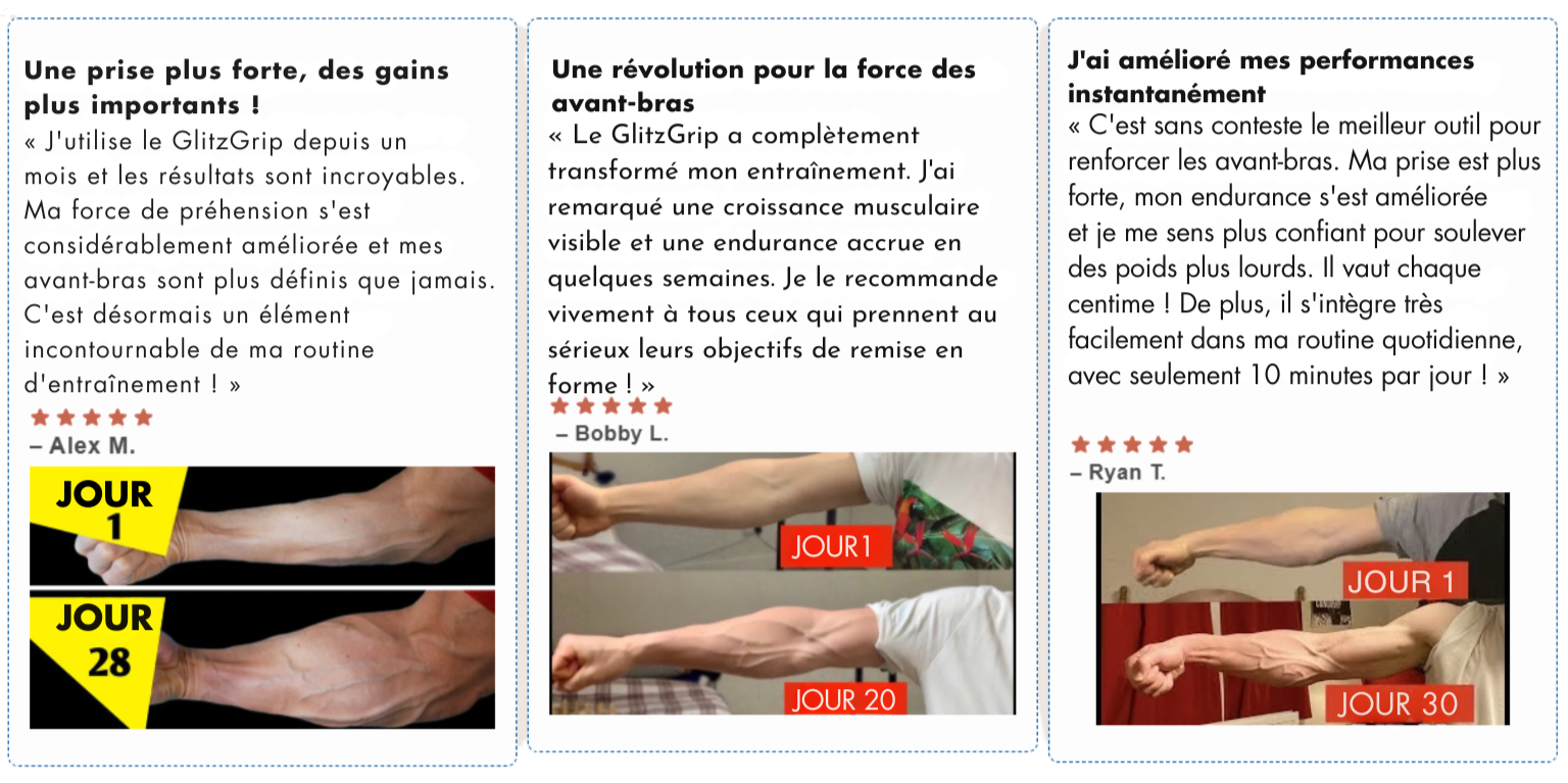 En tant que coach sportif, je recommande toujours à mes élèves d'utiliser deux GlitzGrips pour entraîner les deux bras en même temps, même lorsqu'ils regardent simplement la télévision chez eux. En seulement 10 minutes par jour, vous renforcerez vos avant-bras, votre prise et vos biceps sans avoir à vous rendre à la salle de sport. GlitzGrip renforce votre prise, vos avant-bras et vos bras tout en améliorant la coordination nerveuse et musculaire, le contrôle, l'endurance et la puissance, le tout en seulement 10 minutes par jour ! Si vous n'avez pas le temps ou que vous trouvez toujours des excuses, GlitzGrip va changer la donne. Il vous suffit de saisir les deux poignées, de vous entraîner depuis votre canapé et de constater les résultats en moins d'un mois !