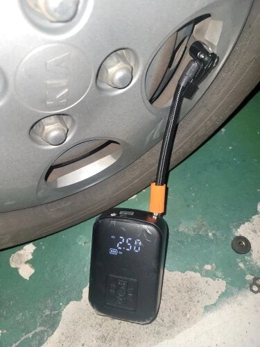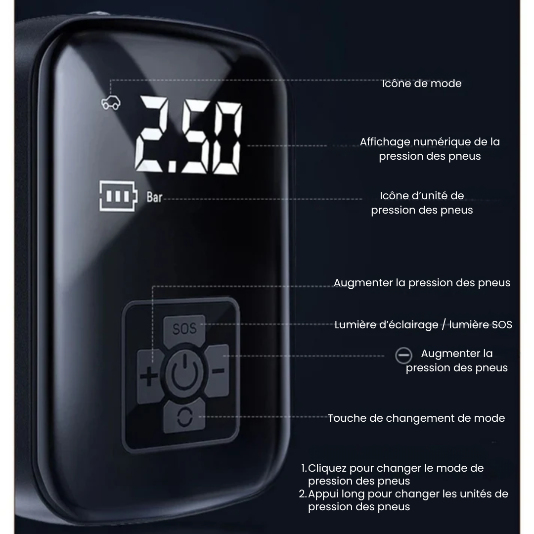 Il suffit de connecter le compresseur à la valve de vos pneus, de régler la pression souhaitée via l’écran numérique, et l’appareil gonflera automatiquement le pneu à la bonne pression. Une fois la pression atteinte, le compresseur s’arrête automatiquement.