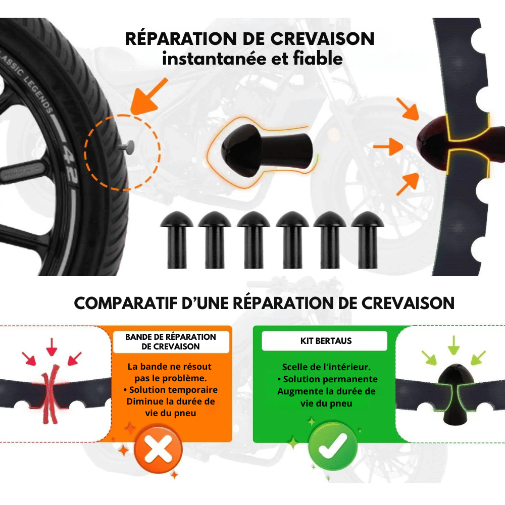Absolument. Le Kit FB10 fonctionne sur tous les pneus tubeless : voiture, moto, scooter, VTT, tracteur, etc.