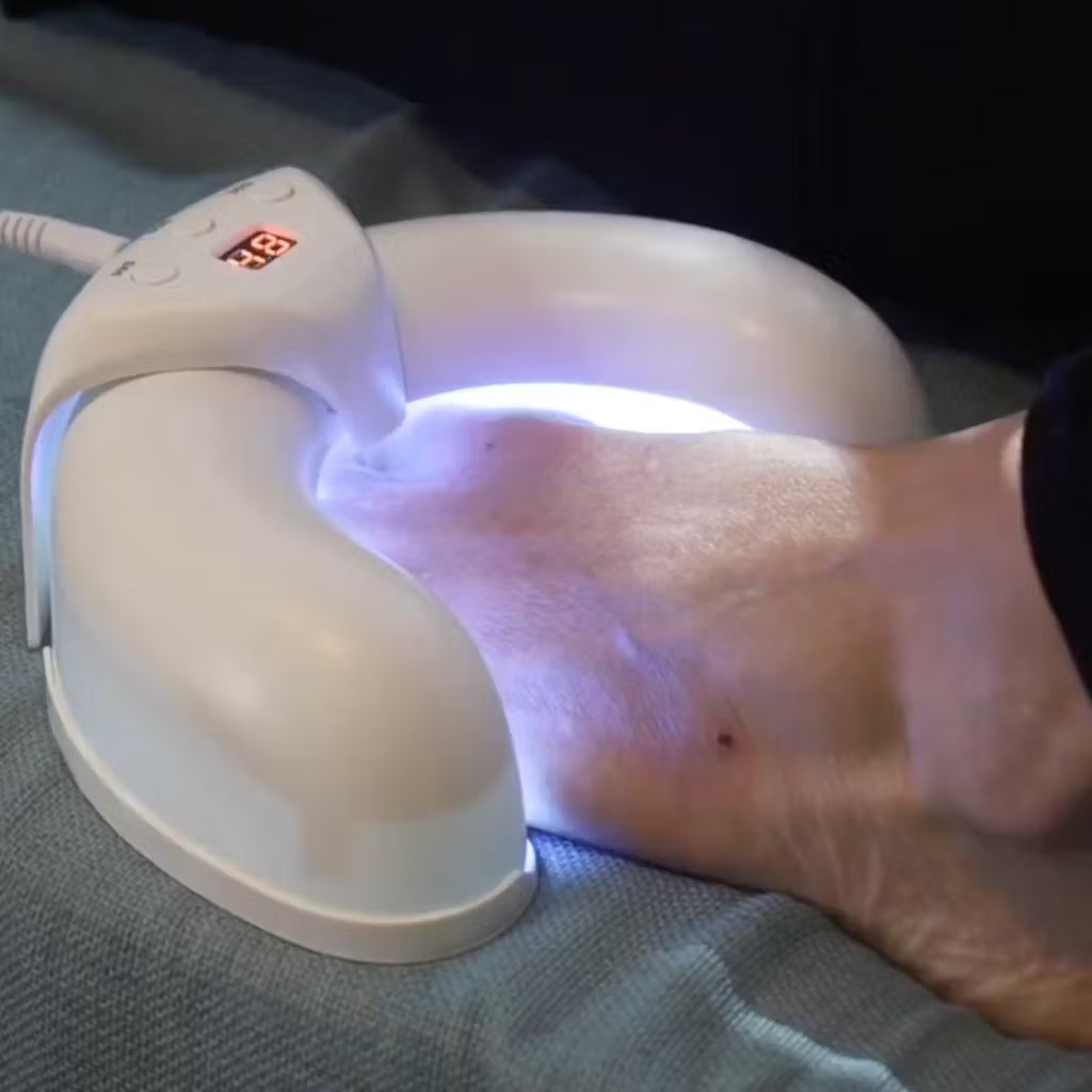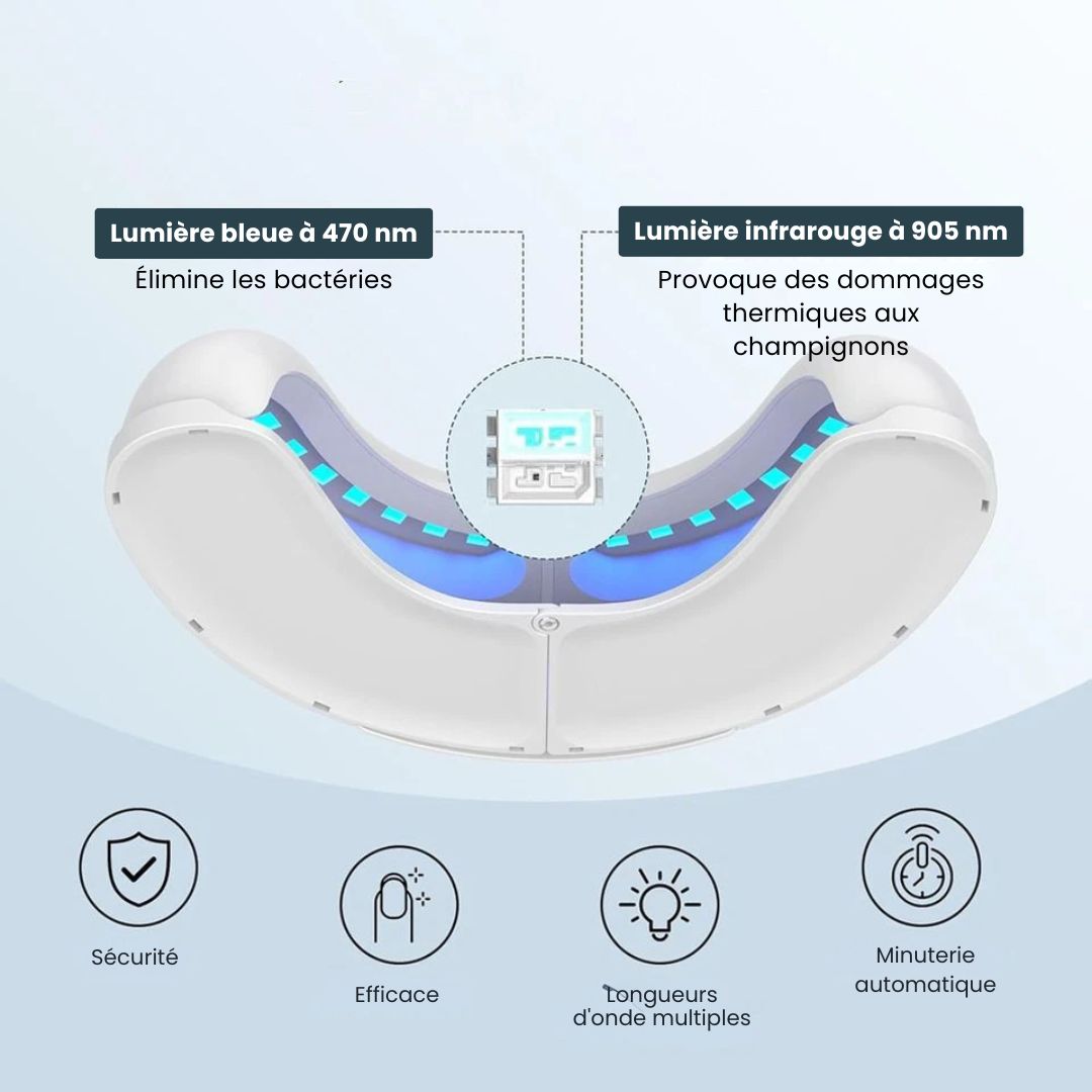 Traitez l’onychomycose de façon sûre, efficace et indolore grâce à la lumière UV-LED double (365–405 nm).