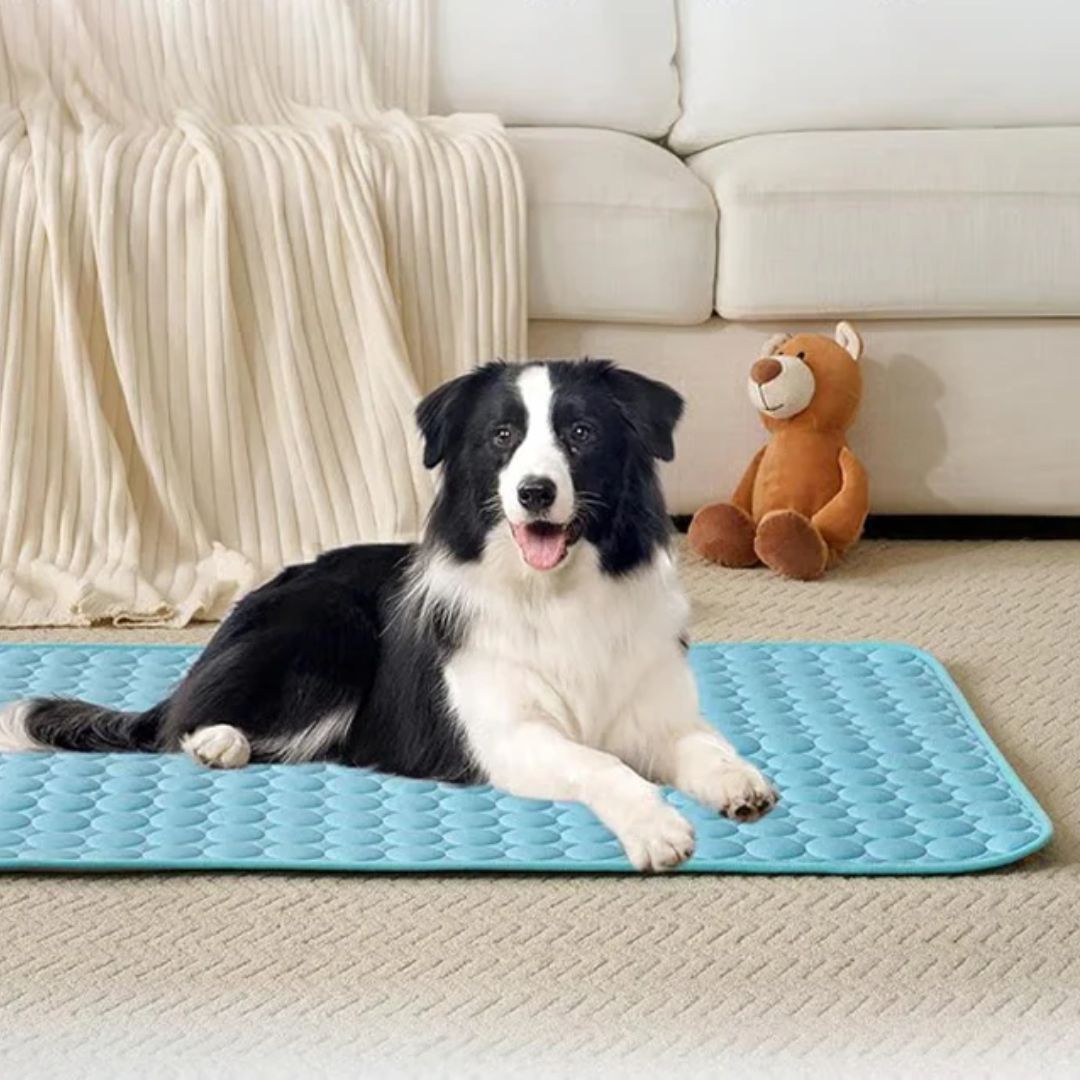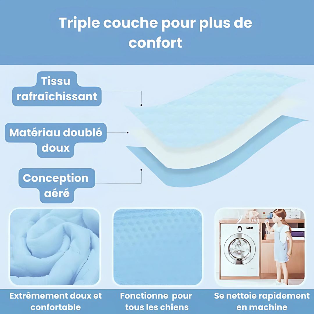 Tapis auto-rafraîchissant révolutionnaire qui régule naturellement la température corporelle de votre chien, évitant ainsi la surchauffe et la déshydratation – sans électricité, sans réfrigération et sans gels dangereux.